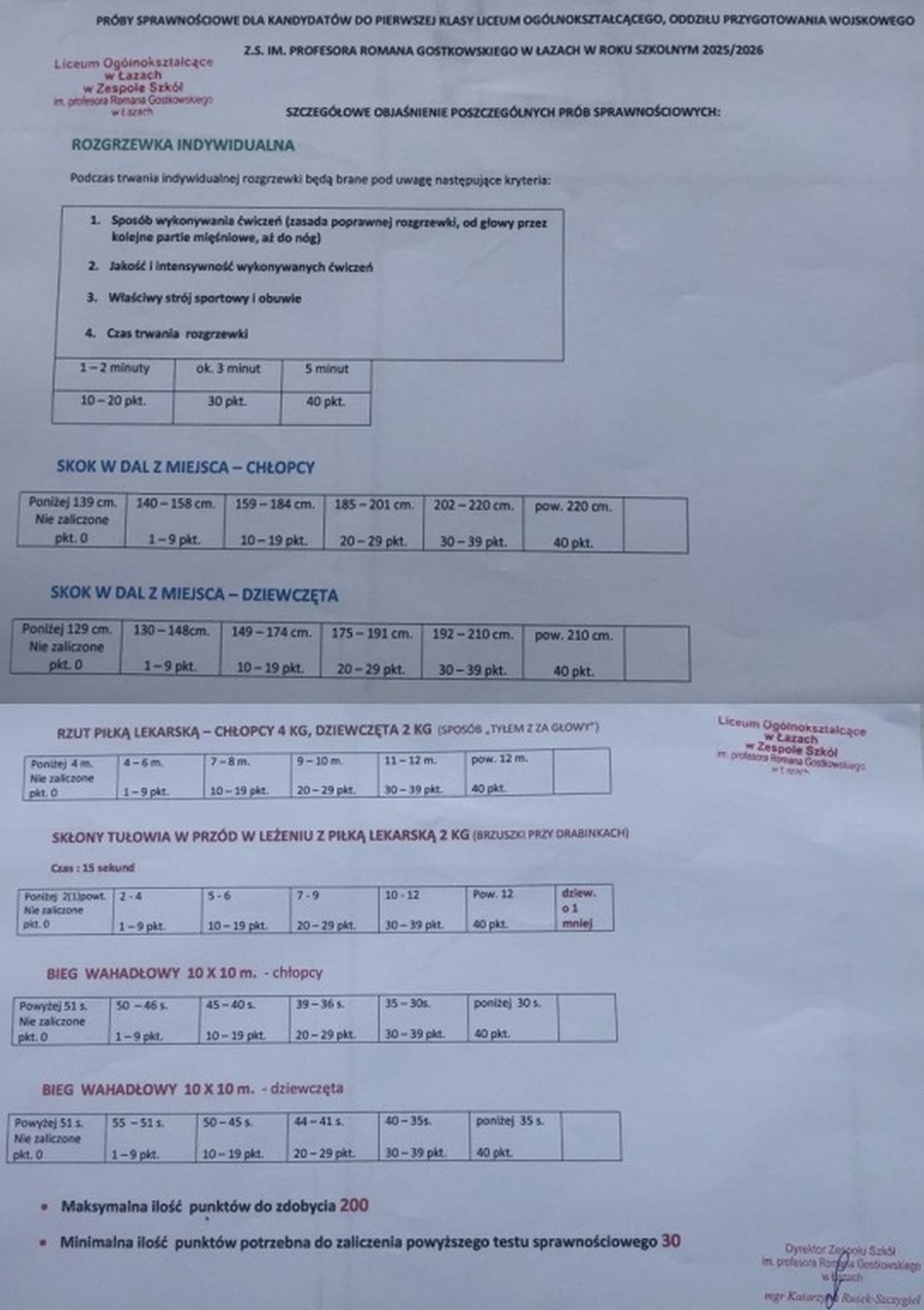 przeciąganie liny, tor przeszkód, rzut granatem, test